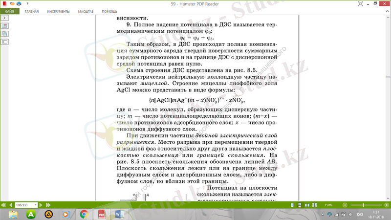 7. Қарсы иондардың адсорбциялық қабаты қатты бөлшектердің зарядталған бетіне іргелес және гидратизацияланған қарсы ионның диаметрінің қалыңдығына ие. Бұл кеңістіктегі қарсы конструкцияларды адсорбциялық қарсы иондар деп атайды. Олар зарядталған қатты бөлшектермен күштің екі түрімен - адсорбция және электростатикалық байланыстармен байланысты. Бұл байланыс соншалықты күшті, тіпті адсорбция қабатының қарсы иондар конструкциясы қатты бөлшектермен қозғалады, одан бөлінбейді, онымен біртұтас кинетикалық бүтіндік - коллоидтық бөлшектер. Адсорбция қабатының қарсы иондары қабатта біркелкі бөлінеді, сондықтан әлеуетті құлдырау сызықты және бірдей болады.