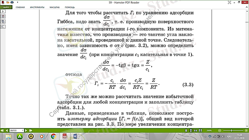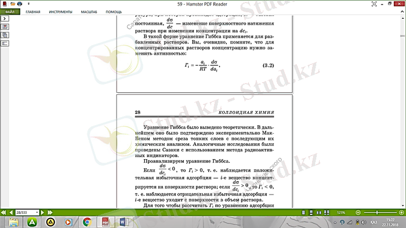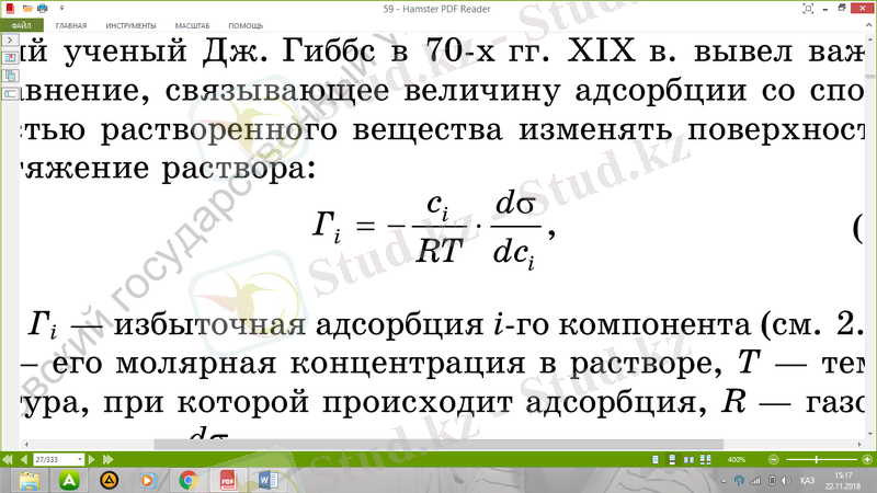 Сұйық ерітінді - газ интерфейсіндегі адсорбция: беткей кернеудің шоғырлануы мен табиғатына тәуелділігі және Гиббс адсорбция теңдеуі