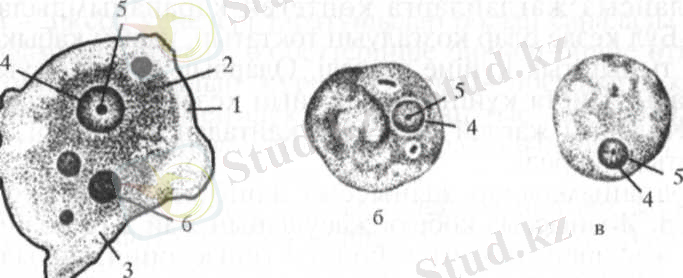 а) ірі вегетативтік формасы, б, в) ұсақ вегетативтік формасы: 1-эктоплазма, 2-эндоплазма, 3-жалған аяқтары, 4-ядро, 5-кариосома, 6-ас қорыту вакуоляларындағы эритроциттер; г) циста.