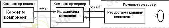 AS - моделінде (сурет 1. 3) компьютер-клиентте орындалатын үрдіс мәліметтерді енгізу және көрсетуге жауап береді (яғни, бірінші топтың қызметтерін жүзеге асырады) . Қолданбалы функциялар қашықтықтағы компьютерде қызмет ететін үрдістер тобымен (қолданба серверлері) орындалады. Қолданбалы есептерді шешу үшін қажетті ақпараттық ресурстарға қатынау RDA-моделіндегідей әдіс бойынша қамтамасыз етіледі. Қолданбалы компоненнттерден әртүрлі түрдегі ресурстарға қатынау бар- мәліметтер базасы, индекстелген файлдар, кезектер және т. б. Ереже бойынша, қосымшалар сервері ресурс менеджері қызмет ететін компьютерде орындалады, бірақ басқа компьютерлерде де орындалуы мүмкін.