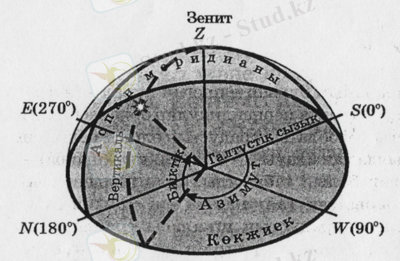 Координаталардың көкжиектік жүйесі. Жұлдыздардың көкжиекке және дүние бұрыштарына қатысты көрінерлік орналасуын қарастырсақ, онда координаталардың көкжиектік жүйесін алу ыңғайлы. Бұл жүйедегі негізгі жазықтық - математикалық көкжиек жазықтығы. Аспан шырағының орны екі бұрышпен анықталады, оның бірі - көкжиек сызығы бойымен өлшенетін шырақ вертикаліне дейінгі бұрыш - азимут астрономияда, әдетте, оңтүстік нүктеден батысқа қарай, ал географияда солтүстік нүктеден шығысқа қарай есептелінеді. Екіншісі - вертикаль бойымен өлшенетін (1. 5-сурет) шырақтың көкжиектен бұрыштық қашықтығы - шырақ биіктігі(һ) .