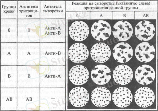 Индивидтердің эритроциттерінің қан топтарымен 0, А, В және АВ Сарысудың (анти-А және анти-в) антиденелерімен өзара әрекеттесуі.