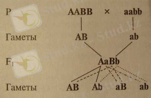 Бірінші ұрпақ будандары фенотип бойынша да, генотип бойынша да біркелкі. Олар төрт түрлі үлгідегі гаметалар құрайды - АВ, Ab, aB, ab