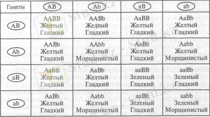 16 (яғни 9/16) теориялық күтіліп отырған ұрпақтарының бір уақытта екі доминантты белгісі бар екеніне көз жеткізу оңай (сары тегіс бұршақ - жг) ; 3/16 - доминантты және рецессивті белгісі (сары морщинистые - жм) ; 3/16 - рецессивті және доминантты белгілері (жасыл тегіс - зг) және 1/16 ұрпақтардың бір мезгілде екі рецессивті белгісі бар (жасыл және морщинистые - зм) .
