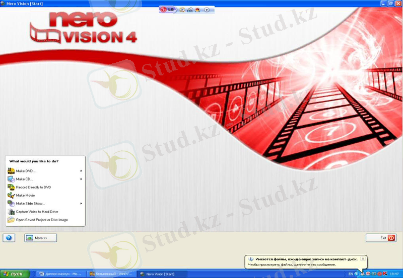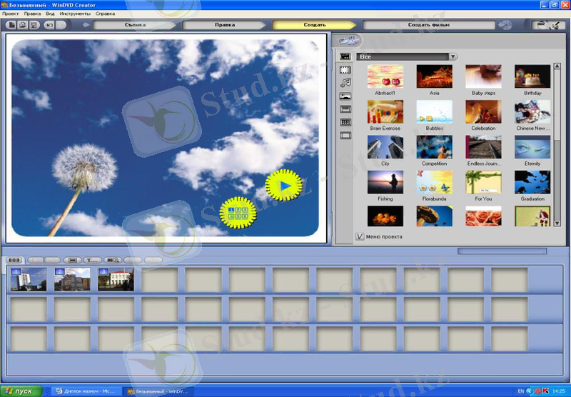 Барлық өңдік суреттер мен өңдік дыбыстық әуендер таңдалып қойылып болғаннан кейін (Создать фильм) мәзірін орындау арқылы тасымалдаушы дискілерге жазу мүмкіндігіне қол жеткіземіз.