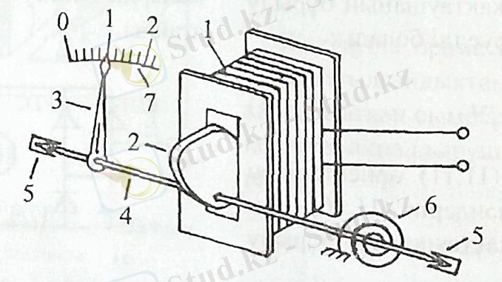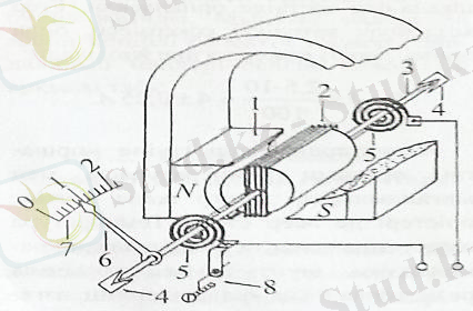 1- тұрақты магнит; 2 - жақтауша орама; 3 - ось; 4 - уяшық; 5 - серіппе; 6 - аспаптың miлi; 7 - шкала; 8 - корректор