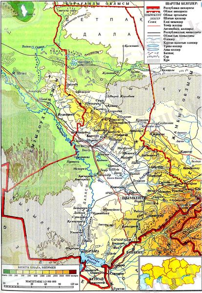 Карта 1 Оңтүстік Қазақстан облысының физикалық картасы
