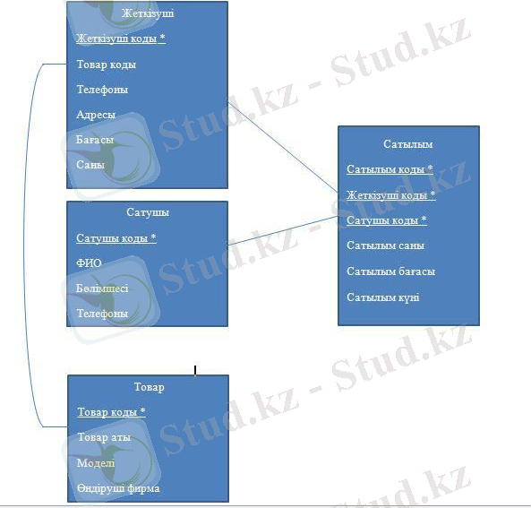 - Сатылым (сатылым коды, жеткізуші коды, сатушы коды, тауар аты, сатылым саны, сатылым бағасы, сатылым күні) ;