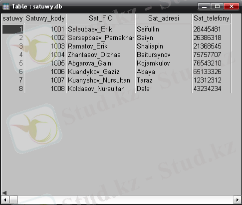 - Сатушы (сатушы коды, аты-жөні, бөлімшесі, телефоны) ;