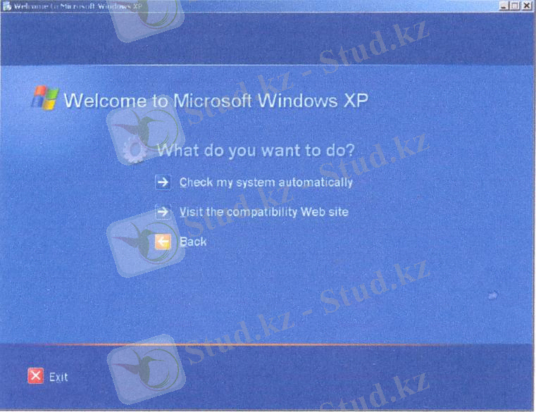- Пайда болғанWindows XP Setup-қа қош келдіңіз (Welcome to Windows XP Setup) терезесінЖүйенің сәикестігін тексеру (Check system compatibility) операциясын, содан кейінЖүйені автоматты түрде тексеру (Check system automatically) опциясын таңдау керек.