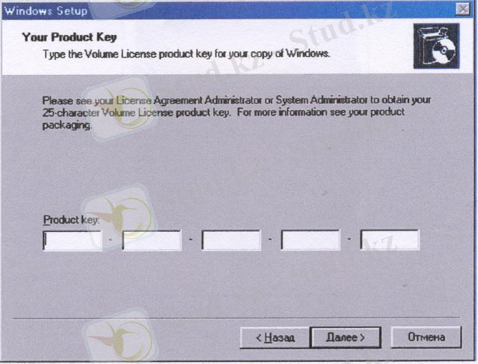 Өнім кілтін енгізу. Өнім кілті (Product Кеу) дистрибутивтің қорапшасында жазылады. Ол бес-бестен бөлінген 25 таңбадан тұратын таңбалар жиыны. Мысалы: VP3WH-BJVP8-HRY4Y-T7YFJ-G3XQY