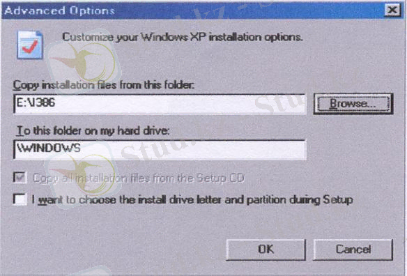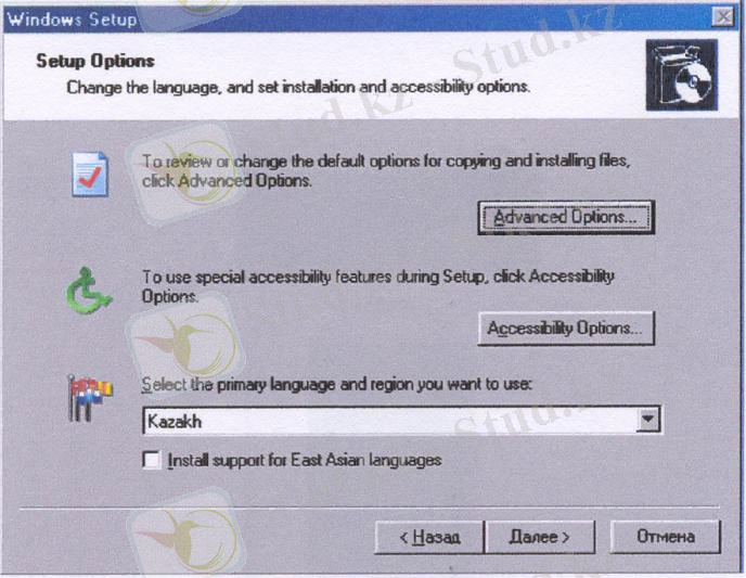 терезесінен қолданушыға ыңғайлы параметрлер енгізуге болады. Қосымша параметрлер . . . (Advanced Options . . . ) терзесінде орнатылатын файлдарды қай папкадан ( Сору installation files from this folder :) және қатты дискідегі қай папкаға ( То this folder on my hard drive :) көшіруге болатынын көрсетуге болады.