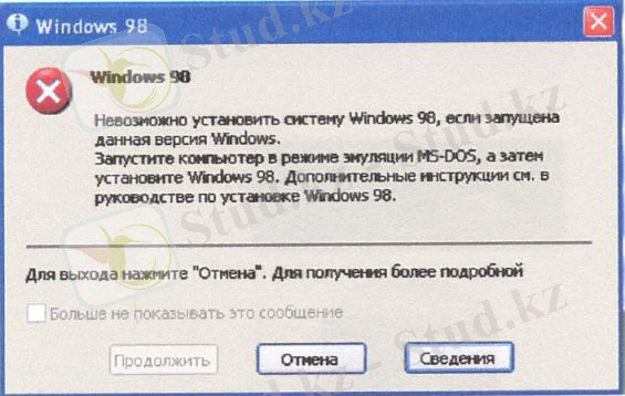 Егер компьютерде Windows ХР операциялық жүйесі орнатылған болса және оған қоса Windows 98 операциялық жүйесін орнату мақсатымен жүктеуші дискісін салсақ, келесі хабарлама шығады.