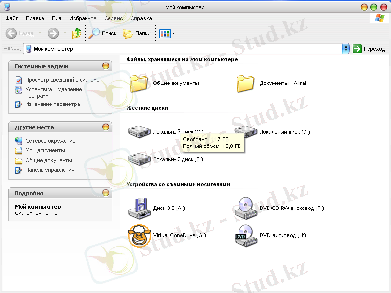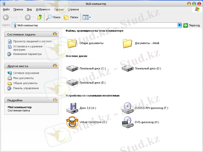 - С: дискіде көрінген мазмұндарды сары түсті сумкаға ұқсайтын сым белгілер құжат қыстырғыштар болып, қалғандары сәйкесті программалар арқылы қалыптасқан құжаттар. Құжаттарды қайсысы бізге қажет болса оны ашуымызға болады.