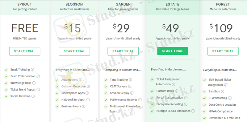Freshdesk қосымшасы тегін және бес ақылы жоспарларда қолдау көрсете алады: sprout, blossom, garden, estate және forest. Олардың бағасы мен қызмет ету функциялары 1. 4-суретте көрсетілген [4] .