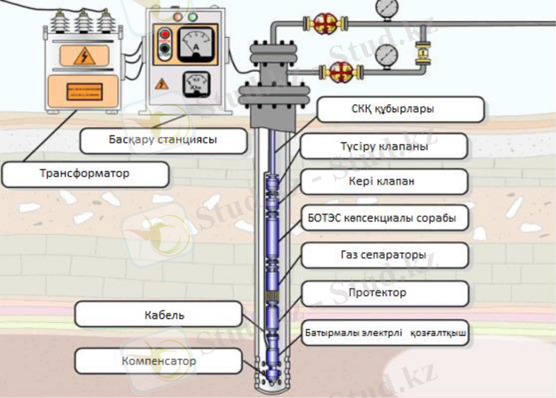 БОТЭС қондырғысы батырылатын агрегаттан, сағаның жабдықтарынан, электр жабдықтарынан және СКҚ бағанасынан тұрады. Ұңғымадан сұйықтықты көтеру электр ортадан тепкіш сорабының жұмысы есебінен жүзеге асырылады, оның функционалдық схемасы 3. 1- суретте көрсетілген.