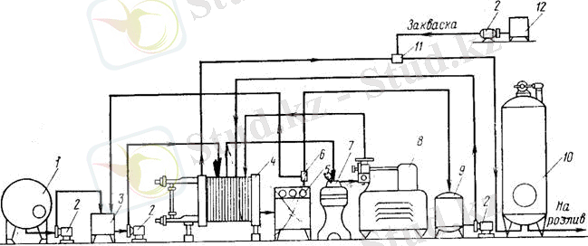 1, 4, 10, 12- сораптар; 2- сүт ыдысы; 3- теңгергіш ыдыс; 5- пластиналы пастерлеуіш-салқындатқыш; 6- басқару пульті; 7- сепаратор; 8- гомогендеуіш, 9- жетілдіргіш; 11- қышқыл сүт өнімдеріне арналған ыдыс;