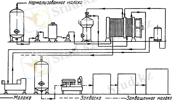 1- нормалданған сүт ыдысы; 2, 4- сораптар; 3- теңгергіш ыдыс; 5- пластиналы патерлеуіш-салқындатқыш; 6- басқару пульті; 7- сепаратор; 8- гомогендеуіш; 9- жетілдіргіш; 10- араластырғы; 11- аралық ыдыс; 12- ыдысқа қалыптау автоматы; 13- термостаттық камера;