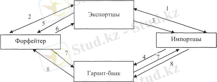 Сонымен бірге, форфейтер тұрғысынан тәуекел жоғары болып табылады, сондықтан да каржыландыру әдісін колданғанда тәуекел-дерді минималдау және хеджирлендіруге аса зор көңіл бөлінеді. Форфейтингте төлем міндеттемелер мен вексельдердің қозғалысы 5-суретте көрсетілген:
