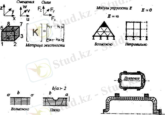 түйіндері бар ең қарапайым үшөлшемді сызықтық элементті қарастырайық (2. 5-Сурет) . Түйіндердің әрқайсысында еркіндіктің 3 дәрежесі бар. Бұл 24 түйіндік ығысуларды және тұра сондай түйіндік күштерді қарастыру қажеттігін білдіреді. Осылайша, түйіндік ығысулардың векторын түйіндік күштердің векторымен байланыстыратын қатаңдық матрицасының [К], өлшемділігі [24 х 24] болады.
