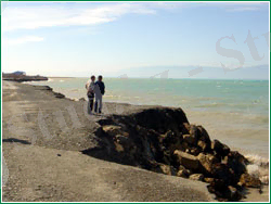 Ені мен биіктігі көп жылғы су деңгейінің тербелісі кезеңіне байланысты өзгеретін клиф етегінің оңтүстік-батыс және оңтүстік-шығыс жағалауларының жемірілген бойы малта-қиыршық тасты жағажайға дейін жайылған. Бұл жердегі қайталама жинақталудың пайда болу сипаты қорғаныс шығанағын құратын малта тасты енсіз түбек болып табылады. Енсіз түбектің ені мен биіктігі де көп жылғы су деңгейінің тербелісіне байланысты өзгереді. 1950-1957 жылдары трансгрессияға байланысты көлдің жемірілген жағасының қарқынды өңделуі, енсіз түбектің және табиғи