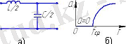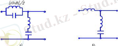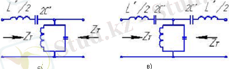 Осы жағдайда ω<ω 0 жиіліктер кезінде бойлық иық сыйымдылық сипатына ие болады, ал көлденең кезінде - индуктивтілікке ие. Сөйтіп, резонанстық жиіліктен кіші жиілікте, тізбектің эквивалентті сызбасы 1. 6., а түріне ие болады және ЖЖФ ұсынады, ал ω>ω0 кезінде - суреттін 1. 6, б түрінде және ТЖФ ұсынады, сондықтан жолақты фильтртің барлық жиілікті сипаттамалары бірге қосылған ЖЖФ және ТЖФ сипаттамалары болады. ω т және ω ж жиіліктер, ТЖ және ЖЖ фильтрлер қимасының жиілігі болып келетін, төменгі өрнектен анықталады (1. 2)