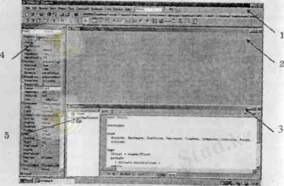 1-Негізгі терезе; 2-пішін терезесі; 3- бағдарлама кодының терезесі;