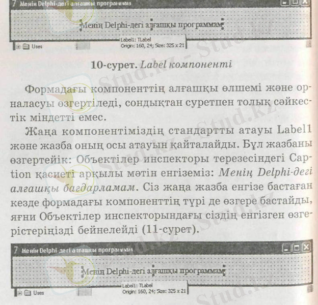 Жаңа компонентіміздің стандартты атауы Label1 және жазба оның осы атауын қайталайды. Бұл жазбаны өзгертейік: Объектілер инспекторы терезесіндегі Сaption қасиеті арқылы мәтін енгіземіз: Менің Dеlрhі-дегі алғашқы бағдарламам. Сіз жаңа жазба енгізе бастаған кезде формадағы компоненттің түрі де өзгере бастайды, яғни Объектілер инспекторындағы сіздің енгізген өзгерістеріңізді бейнелейді (11-сурет) .