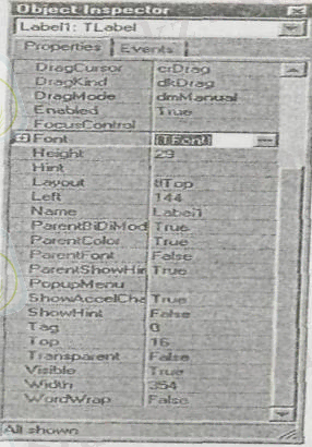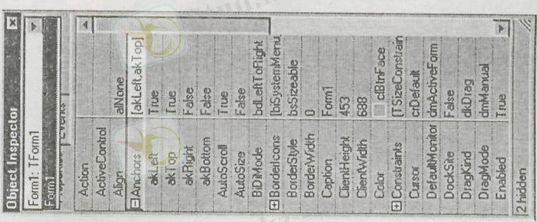 Формада орналасатын кез келген компонент белгілі бір параметрлермен сипатталады: орналасуымен, өлшемімен, түсімен, т. б. Бағдарламашы осы параметрлердің бір бөлігін, мысалы компоненттің орналасуы мен өлшемін форма терезесінде өзгерте алады. Объектілер инспекторы терезесі параметрлерді өзгертуге арналған (5-сурет) .