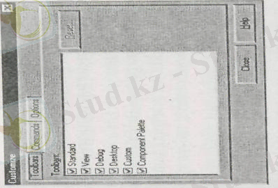 Батырмалардың құрамын өзгерту үшін кез келген батырмаға оң жақ тінтуір батырмасымен шертіңіз және ашылған қосымша менюдің ішінен Customize (жаңарту-модифицировать) опциясын таңдаңыз, сол сәтте экранда терезенің элементтерін реттейтін қосымша сұхбат терезесі ашылады (2-сурет) .