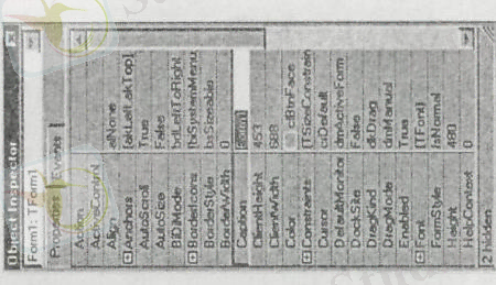 Бұл терезе Рroperties (қасиеті - свойства) және (оқиға - события) деген екі парақтан тұрады. Рroperties парағы компоненттерге қажетті қасиетті орнатуға арналған, ал Еvents парағы компоненттің әр түрлі жағдайға байланысты әрекетін анықтайды.