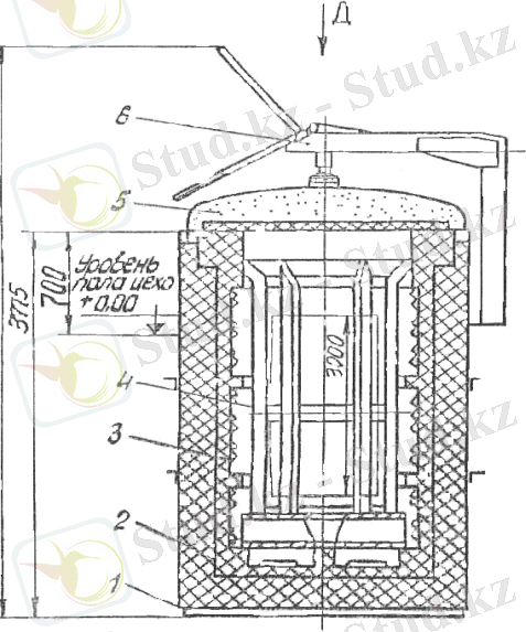 1 - қаптама; 2 - футеровка; 3 - қыздырғыш; 4 - бағыттағыш; 5 - қақпақ; 6 - көтеру механизмі; 7 - монтаж проводов