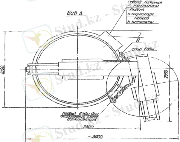 1-қаптама; 2-футеровка; 3-қыздырғыш; 4-бағыттағыш; 5-қақпақ; 6-көтеру механизмі; 7-монтаж проводов; 8-монтаж водоохлаждения