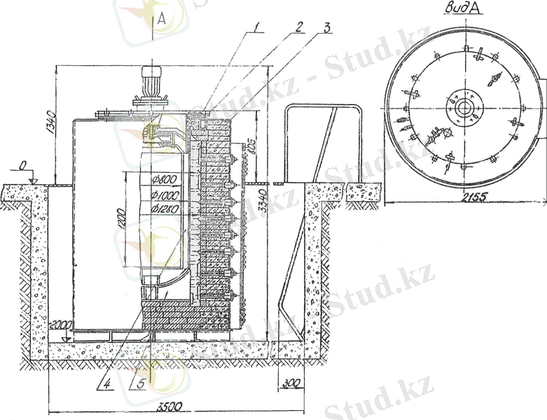 1 - қақпағы бар желдеткіш; 2 - контейнер; 3 - шахта; 4 - цилиндр; 5 - тұғырық.