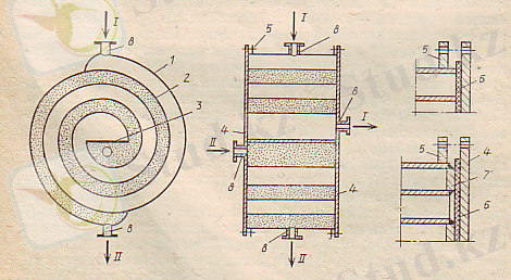 Спиральды жылуалмастырғыш. (1. 1. 2-сурет) Екі жұқа табақты металл 1, 2 спираль бойынша оралған. Спиралдардың ішкі шеті бөгетке 3, ал сыртқы беті бір-біріне пісіру арқылы біріктірілген. Спиральдың екі жағы қақпақпен 4, 5 бекітілген.