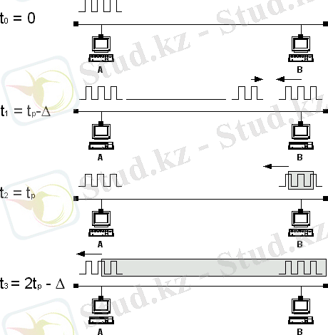t0 уақыт кезеңінде А түйіні хабар беруді бастап, өз сигналдарын тыңдап отырады. t1 кезеңінде хабар В түйініне жете бергенде, ол түйін хабар басталғанын білмей, өзі хабар жібере бастайды. t2=t1+∆ кезеңінде В түйіні қақтығыс барын анықтайды (тыңдалатын желідегі электр сигналының тұрақты шамасы ұлғаяды) . Содан кейін В түйіні jam-сигнал жіберіп, хабарын тоқтатады. t3 кезеңінде қақтығыс сигналы А түйініне жетеді, содан кейін А да jam-сигнал жіберіп, өз хабарын тоқтатады.