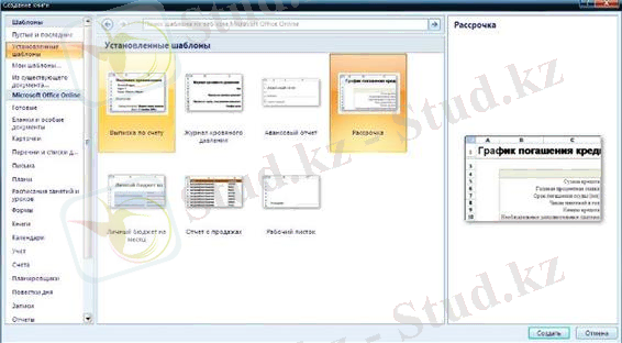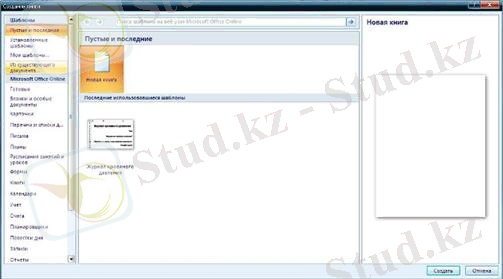 Терезенің орталық бөлігінде бос шаблондар (Excel-дің бос жұмыс кітабы), сонымен қатар соңғы қолданылған шаблондар орналасқан. Оң жақтағы аймақ таңдалған шаблонды алдын-ала қарауға мүмкіндік береді. Сол жақтағы аймақ шаблонның қажетті категорияларын көрсетеді. Орнатылған шаблон категориясын таңдап, келесі шаблонды алуға болады: