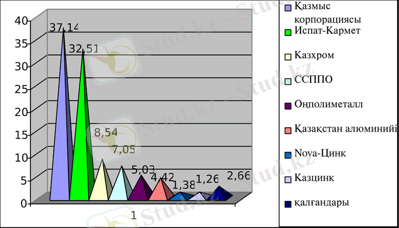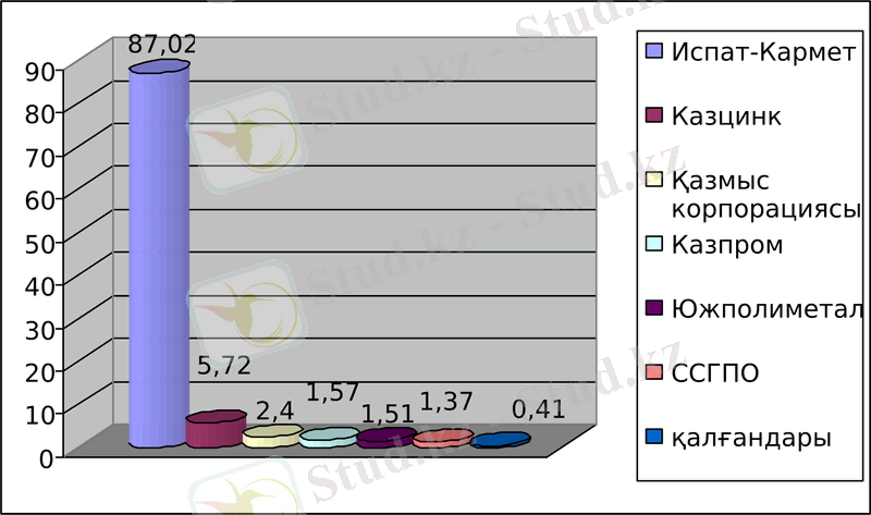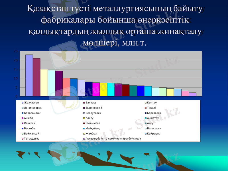 Экология және табиғи қорлар Министірлігінің есебі бойынша түсті және қара металлургия, жылу энергетикасы, фосфор және т. б. өнеркәсіптер табиғи ортаны тұрақты ластаушы көздер қызметін атқарады. Ластау барысында әсіресе түсті металлургия кәсіпорындарының алатын орны ерекше. 1-суретте Қазақстан түсті металлургиясы өндірістерінің байыту фабрикалары бойынша өнеркәсіптік қалдықтардың жылдық орташа жинақталу мөлшері көрсетілген [2] .
