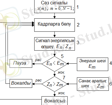 Төмендегі суретте сөз сигналын тыныштық, вокалды және вокалсыз жерлерге бөлу алгоритмы көрсетілген. Бұл алгоритм сөз сигналы - айнымалы, қысқа мерзімді энергия мөлшері және нөл арқылы өту аралықтары күрт өзгеретін тұрақсыз үрдіс ретінде қарастырамыз.