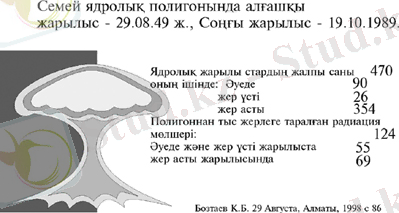 Қазақстан территориясында қуатты ядролық сынақтардың ең көп мөлшері жасалды. Семей Полигонында 1949 жылдан 1989 жылға дейін 470 ядролық жарылыс, оның 90-ы ауада, 354-і жер астында және 26-сы жер бетінде жүргізілген.