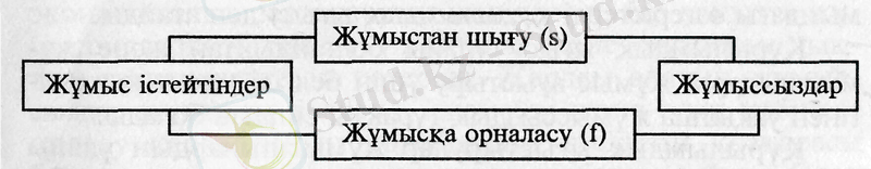 Жұмысы барлар қатарынан жұмыссыздар қатарына ауысу және керісінше. Белгілі уақыт аралығында жұмыс істейтін адамдар бөлігі (s) өзінің жұмыс орындарын жоғалтады, ал жұмыссыздар белігі (f) жұмыс табады. Жұмысқа орналасу және жұмыстан шығу көрсеткіштері жұмыссыздық деңгейін анықтайды [2] .