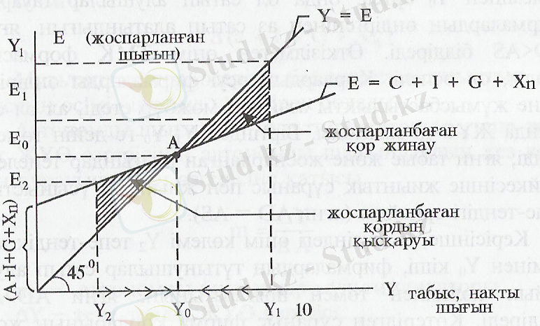 Жоспарланған шығын сызығы, нақты және жоспарланған шығындар теңелген сызықты белгілі бір А нүктеде кесетіні анық (яғни, Y=E сызығын) . Келтірілген сызба Кейнс қисығы атауын алған. Y=E сызығында әрқашан іс жүзіндегі инвестициялар мен қор жинақтар теңдігі сақталады. А нүктесінде табыс жоспарланған шығындарға теңестіріледі, яғни макроэкономикалық тепе-теңдік орнайды.