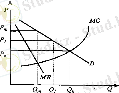 Енді мемлекет тарапынан реттеу болып, тауарға Р1 бағасы қойылады дейік. Соның нәтижесінде тауардың бағасы монополия бағасынан гөрі төмендеп, ал өнім көлемі q1 -ге дейін көбейеді. Бағаны реттеу механизмі бұл жағдайда нарыққа оң әсерін тигізіп тұр, бірақ бұл әдістің шектеуі болады. Бағаны реттеудің ең төменгі деңгейі бәсеке нарығының бағасына келіп тіреледі, одан әрі баға төмендесе, өнім көлеміне азаюына әкеліп соқтырады, яғни монополистің іс-әрекетіне теріс әсерін тигізеді. Монополияға бағаны Р m -нан жоғары белгілесе, ондай жағдайда да баға монополиялық фирманың жұмысына теріс әсер етеді. Сондықтан бағаны реттегенде Р г бәсеке бағасынан жоғары, ал монополия бағасынан төмен болуы керек: Р к < Р 1 < Р т .