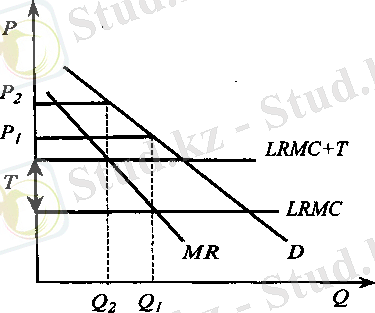 Шекті шығын қисығы LRMC салық көлеміне тең шамаға жоғары қарай жылжиды, себебі салық мөлшерін өндіруші өз шығындарына қосады: LRMC + Т . Сондықтан салық салынғаннан кейін тауардың бағасы да жоғарылайды, бірақ баға түгел салық көлеміне көбеймейді ол салық шамасынан аз болады Р 2 - p1 < Т .