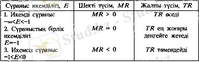 Жалпы жағдайда сұраныстың икемділік коэффициенті Е < 0 , демек монополиялық нарықта тауардың бағасы өндірістің шекті шығынына қарағанда жоғары болады, яғни Р > МС. Монополиялық нарықта Р = МС теңдігі Е = О болғанда ғана орын алады, ал басқа жағдайларда Р > МС. Бұл монополистің белгілейтін бағасы шекті шығыннан сұраныс икемділігіне кері пропорционал шамаға артық болатынын көрсетеді. Шекті түсімнің формуласынан, монополист өндірушінің жалпы табысы тауардың бағасы мен сұраныс икемділігіне байланысты екенін көрдік. Осы байланысты талдау үшін, сұраныс икемділігі өзгеруіне сәйкес жалпы табыстың қалай өзгеретінін сипаттайтын кесте құрамыз: