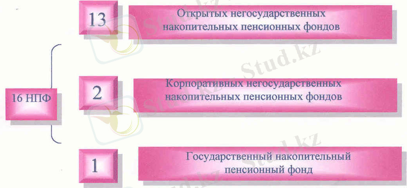 Бұл күнде ҚР зейнетақы қызметін көрсету нарығы мына төменде көрсетілген суреттегідей болып отыр. 16 зейнетақы қоры, оның ішінде 13 ашық типтегі, 2- корпоративтік типтегі және 1- мемлекеттік зейнетақы қоры болып отыр.