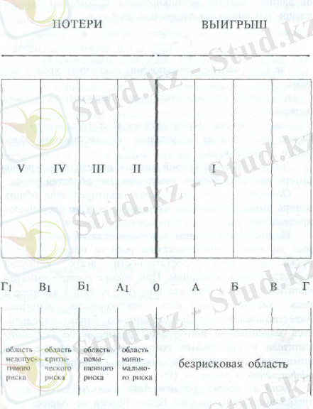 Егер де аталмыш облыстарды анықтаудың негiзi ретiнде Ресей орталық банкiнiң кез келген коммерциялық банктiң активтерi жай-күйiн бағалау жөнiндегi талаптарын алатын болсақ, нарықтық экономика жағдайындағы кез келген фирма қызметiнiң қауiп-қатер облыстарының 5 негiзгi облыстарын бөлуге болады: