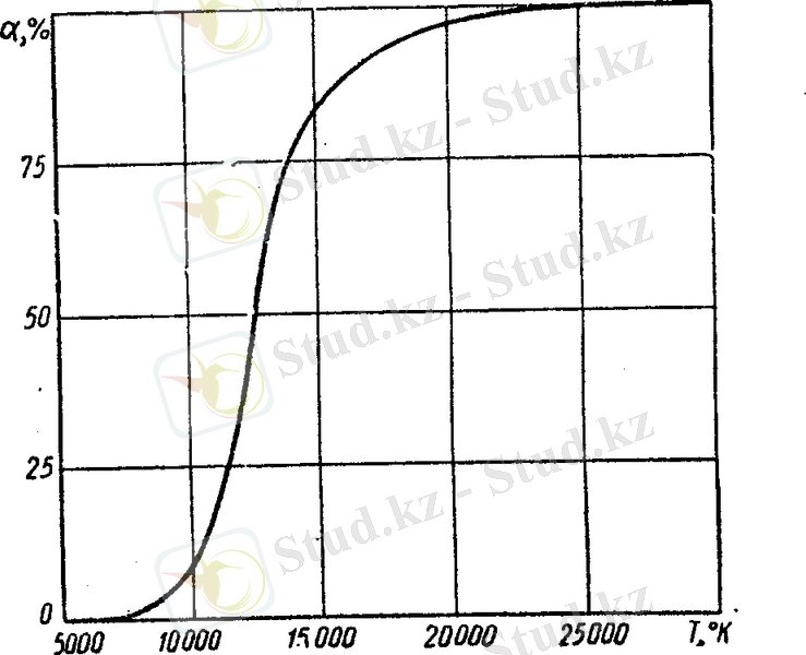 Сондықтан анықтық үшін 1-сур. газ көлемі 1см³ болғанда иондар мен нейтрал атомдардың толық саны 7*10(16) жағдайға ғана тән. Бөлмелік температурада бұндай тығыздықтағы газдың қысымы 1 мм рт. см. Суреттен Т=10 000° болғанда иондалған атом саны сутек атомының толық санынан 10% ке кіші болады да Т=30 000° болғанда 2*100² оң ион санына бір ғана нейтрал атом сай келкді.