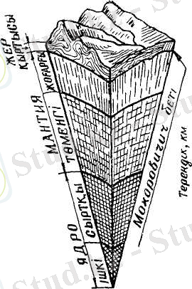 табылып, ол Мохоровичич шегі деп аталды. Ал одан жоғары жаткан қабат жер қабығы деген атқа ие болды, Жер қабығының қалыңдығы барлық, жерде бірдей емес. Мұхиттардың астындағы жер қабығының, төменгі шегі 5-10 километрге, ашық, жазықтарда 30-40 километрге, ал тау алаптары астында 50-80 километрге дейін тереңдеп кетеді. Жер қабығын құрайтын жыныстар да біркелкі болмайды. Оның құрылысын сейсмикалық толқындардың, таралу жылдамдьқтарына сүйене отырып анықтауға болады. Кейінгі кезде жер қабығы континентальды аймақта гранит және базальт, ал мұхиттар астында тек қана базальт қабатынан тұратыны белгілі болды. Мохоровичич шегінен жердің ядросына дейін 2900 километрге дерлік мантия созылып жатыр. Ол орасан зор қысыммен сығылған (4. 10 5 барга дейін) қызуы, 1500-2000 градусқа дейін көтерілген әртүрлі силикаттардан құралатын қатты қабат деп саналады. Ол жоғарғы (900 километрге дейін) және төменгі мантия деп аталатын екі қабаттан тұрады. Егер төменгі мантияның ішкі құрылысы және оны құрайтын жыныстардың физикалық химиялық, қасиеттері біркелкі болса, жоғарғы мантияда олар әр жерде әртүрлі болуы мүмкін деген болжам жасалып отыр. 1910 жылы атақты неміс сейсмологы Бено Гутенберг жер бетінен 2900 км тереңдікте сейсмикалық қума толқындардың жылдамдықтары 13, 6 км сек-тен 8, 1 км сек-ке дейін баяулайтынын және осы тереңдіктен төмен қарай көлденең толқындардың өтпейтінін ашқан. Осының аркасында ол жер ядросы жер бетінен 2900 км тереңдіктен басталады және балқыған темір сияқты металдардан құралады деген қорытындыға келген. Жер ядросының ішінде, шамамен жер бетінен 5100 километрдей тереңдікте ішкі ядро басталады. Ғалымдар оны қатты ауыр металдан құралады деп жорамалдайды. Былай қарағанда жер беті бізге мызғымай, еш уақытта қозғалмай, бір қалыпты тыныш тұратындай көрінеді. Ол шынында да солай ма? Егер біз адамзаттың ежелден бергі тарихына үңілсек, онда жер беті үнемі қозғалыста болып тұрғанын білер едік. Ондай қозғалыстардың іздерін жер шарында көптеген аудандарынан табуға болады. Мысалы, бір кезде түгелдей құрылық бойына салынған дүние жүзіндегі ең әсем қалалардың бірі - Италияның Венеция қаласы қазір жартысы су астында тұр. Голландия жері түгелдей дерлік жылына 1 миллиметрдей төмен түседі. Егер Мұхит суын бөгеп тұрған көптеген көтермелер жүйесі болмаса, оның көп жері су астында қалған болар еді Ал, Скандинавия ше? Ол мұз дәуірінен кейінгі уақыт ішінде шамамен жылына 1 см жоғары көтерілуде. Бір кезде теңіз толқындарының ізі қ алған жартастар қазір су деңгейінен ондаған метр биікте тұр. Айтылған жәйттер кейінгі мыңдаған жылдар д ың ішінде болған оқиғалар. Ал, ер біз, жер шарының геологиялық тарихына үңілсек ол пайда болған 4, 5 млрд. жыл ішінде талай жойқын өзгерістердің болғанын білер едік. Қазір бастарына бұлт ұялаған заңғар таулары бар аймақтарды бір кезде мұхит суы басып жатқан. Ал Кавказ, Альпі, Гималай сияқты тау тізбектері бұдан 25-30 млн . жыл бұрын пайда болған. Әрине, адам өмірімен салыстырғанда бұл өте ұзақ уақыт, ал бірақ жалпы жер өмірімен салыстырсақ, оның жүз елуден бір бөлшегіндей-ақ, тіпті кеше ғана болған оқиға сияқты. Келтірілген деректер жер шарының үнемі қозғалыста болатынын дәлелдейді. Бұл қозғалыстар кейде өте тез немесе баяу, ұзақ немесе қысқа уақытта, аз ғана жерді немесе үлкен территорияны қамтиды. Осындай қозғалыстардың салдарынан жердің бір 
