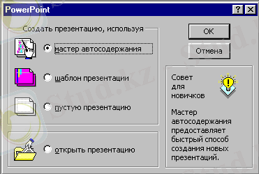 Mіcrosft Power Poіnt программасы іске қосылғаннан кейін пайда болған сұқбат терезеде Автомазмұн шебері өрісін таңдап, ОК батырмасын шертеміз. Осы кезде Автомазмұн шебері іске қосылады.
